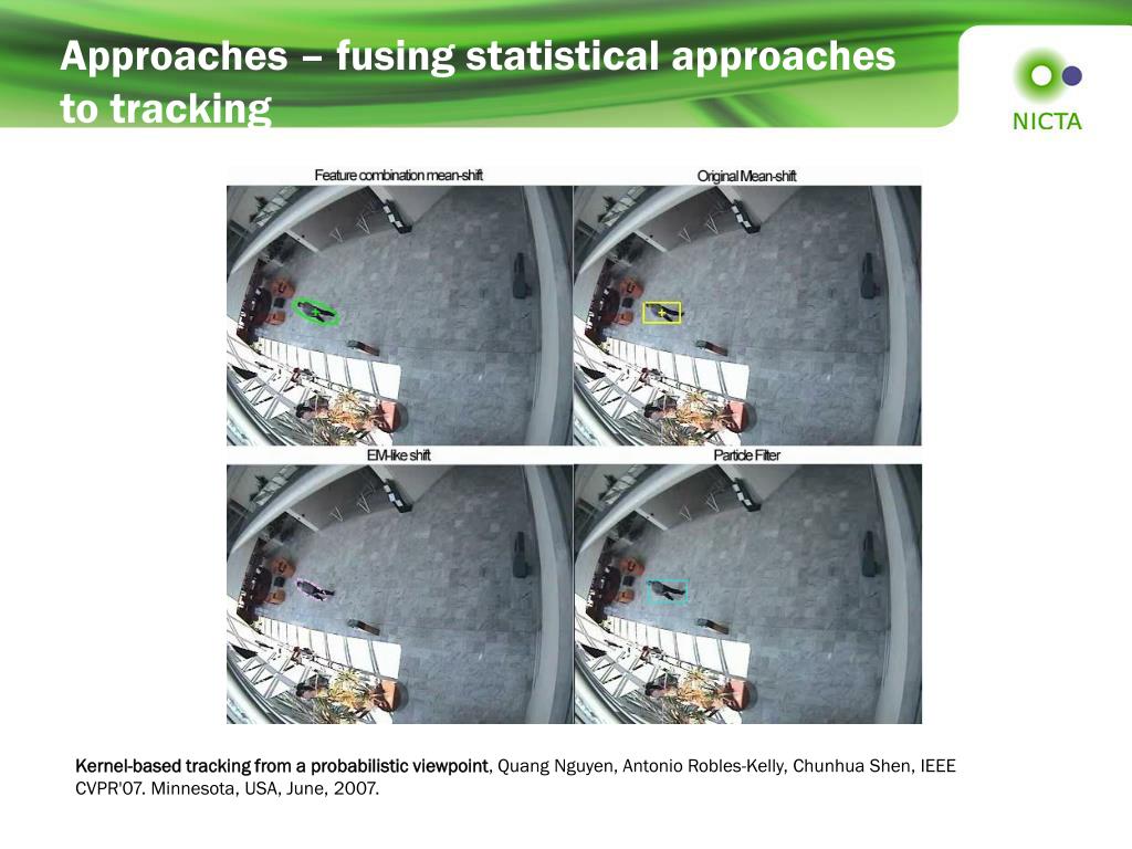 Approaches – fusing statistical approaches to tracking Kernel-based tracking from a probabilistic viewpoint, Quang Nguyen, Antonio Robles-Kelly, Chunhua Shen, IEEE CVPR'07. Minnesota, USA, June, 2007.