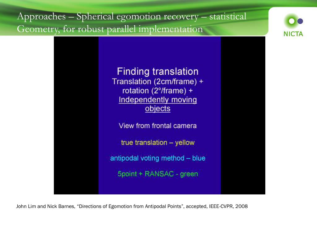 Approaches – Spherical egomotion recovery – statistical Geometry, for robust parallel implementation John Lim and Nick Barnes, “Directions of Egomotion from Antipodal Points”, accepted, IEEE-CVPR, 2008