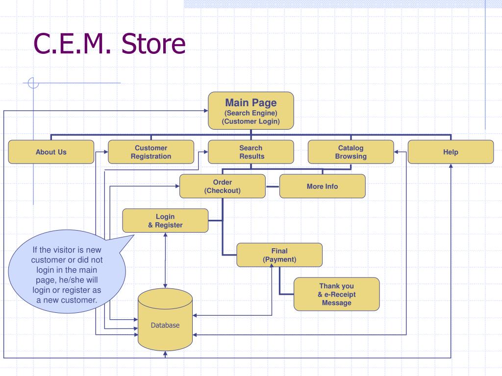 Main Page(Search Engine)(Customer Login) About Us CustomerRegistration Search Results CatalogBrowsing Help Order(Checkout) More Info Login& Register If the visitor is new customer or did not login in the main page, he/she will login or register as a new customer. Final(Payment) Thank you& e-ReceiptMessage Database C.E.M. Store