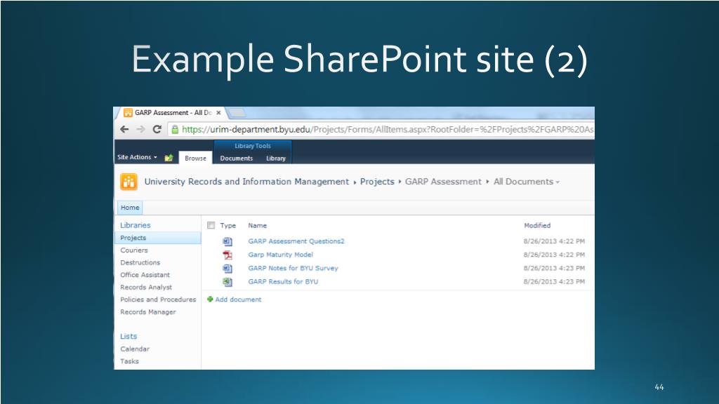 Were to go for information • University Records Management website: • http://sites.lib.byu.edu/recordsmanagement/ • My.BYU.edu, then search for “Records Management” • You do not need to be logged in to perform a search • Call 2-2828 for records pickup/delivery • Call 2-1670 to schedule training • Call 2-2161 for records management guidance
