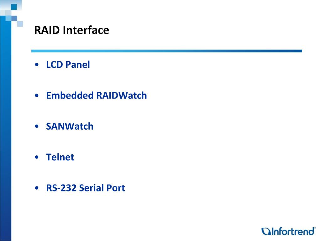 RAID Interface • LCD Panel • Embedded RAIDWatch • SANWatch • Telnet • RS-232 Serial Port
