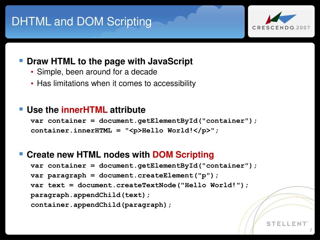 DHTML and DOM Scripting • Draw HTML to the page with JavaScript • Simple, been around for a decade • Has limitations when it comes to accessibility • Use the innerHTML attribute var container = document.getElementById("container"); container.innerHTML = "<p>Hello World!</p>"; • Create new HTML nodes with DOM Scripting var container = document.getElementById("container"); var paragraph = document.createElement("p"); var text = document.createTextNode("Hello World!"); paragraph.appendChild(text); container.appendChild(paragraph);