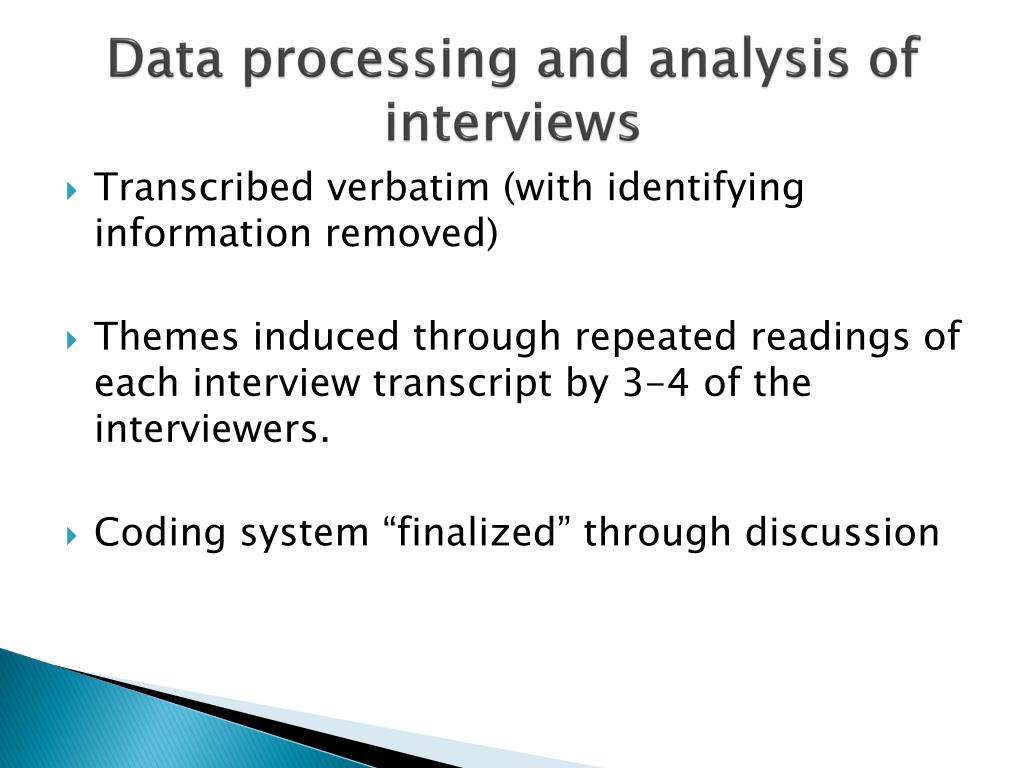 Data processing and analysis of interviews • Transcribed verbatim (with identifying information removed) • Themes induced through repeated readings of each interview transcript by 3-4 of the interviewers. • Coding system “finalized” through discussion