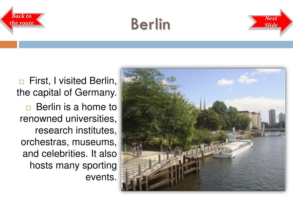 Back to the route Berlin Next Slide • First, I visited Berlin, the capital of Germany. • Berlin is a home to renowned universities, research institutes, orchestras, museums, and celebrities. It also hosts many sporting events.