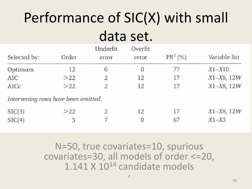 Performance of SIC(X) with small data set. N=50, true covariates=10, spurious covariates=30, all models of order <=20, 1.141 X 1014 candidate models '