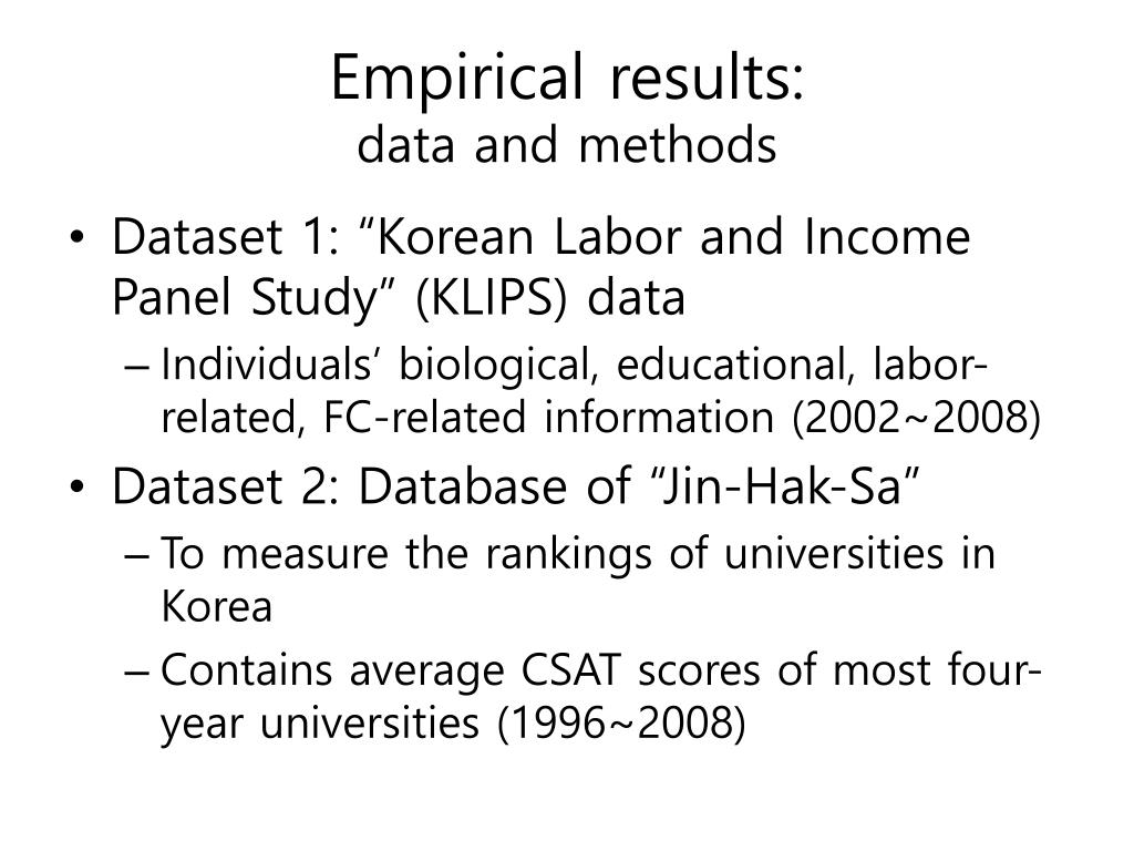 Empirical results:data and methods • Dataset 1: “Korean Labor and Income Panel Study” (KLIPS) data • Individuals’ biological, educational, labor-related, FC-related information (2002~2008) • Dataset 2: Database of “Jin-Hak-Sa” • To measure the rankings of universities in Korea • Contains average CSAT scores of most four-year universities (1996~2008)