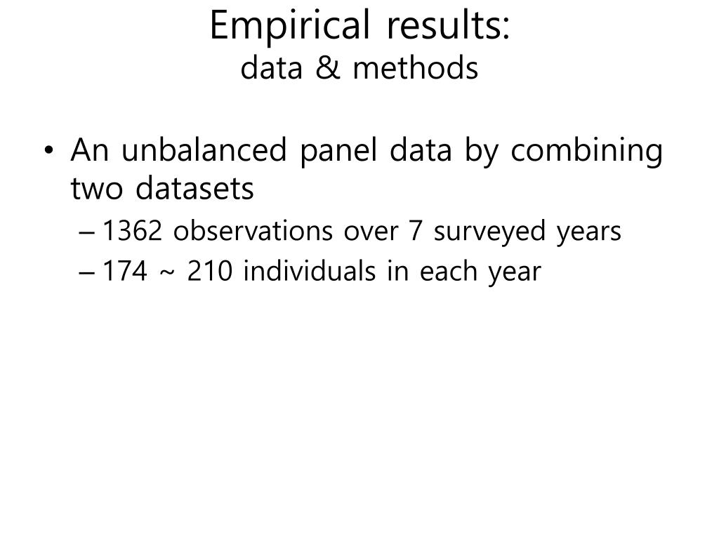 Empirical results:data & methods • An unbalanced panel data by combining two datasets • 1362 observations over 7 surveyed years • 174 ~ 210 individuals in each year