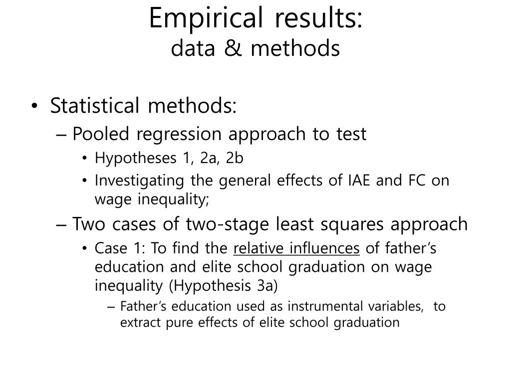 Empirical results:data & methods • Statistical methods: • Pooled regression approach to test • Hypotheses 1, 2a, 2b • Investigating the general effects of IAE and FC on wage inequality; • Two cases of two-stage least squares approach • Case 1: To find the relative influencesof father’s education and elite school graduation on wage inequality (Hypothesis 3a) • Father’s education used as instrumental variables, to extract pure effects of elite school graduation