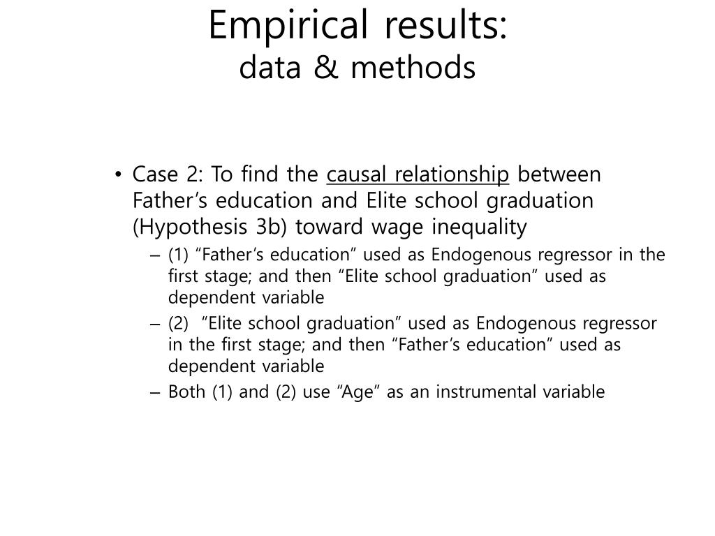 Empirical results:data & methods • Case 2: To find the causal relationship between Father’s education and Elite school graduation (Hypothesis 3b) toward wage inequality • (1) “Father’s education” used as Endogenous regressor in the first stage; and then “Elite school graduation” used as dependent variable • (2) “Elite school graduation” used as Endogenous regressor in the first stage; and then “Father’s education” used as dependent variable • Both (1) and (2) use “Age” as an instrumental variable