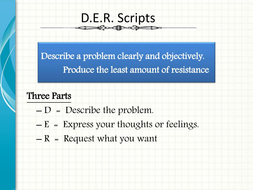 D.E.R. Scripts Describe a problem clearly and objectively. Produce the least amount of resistance Three Parts • D = Describe the problem. • E = Express your thoughts or feelings. • R = Request what you want