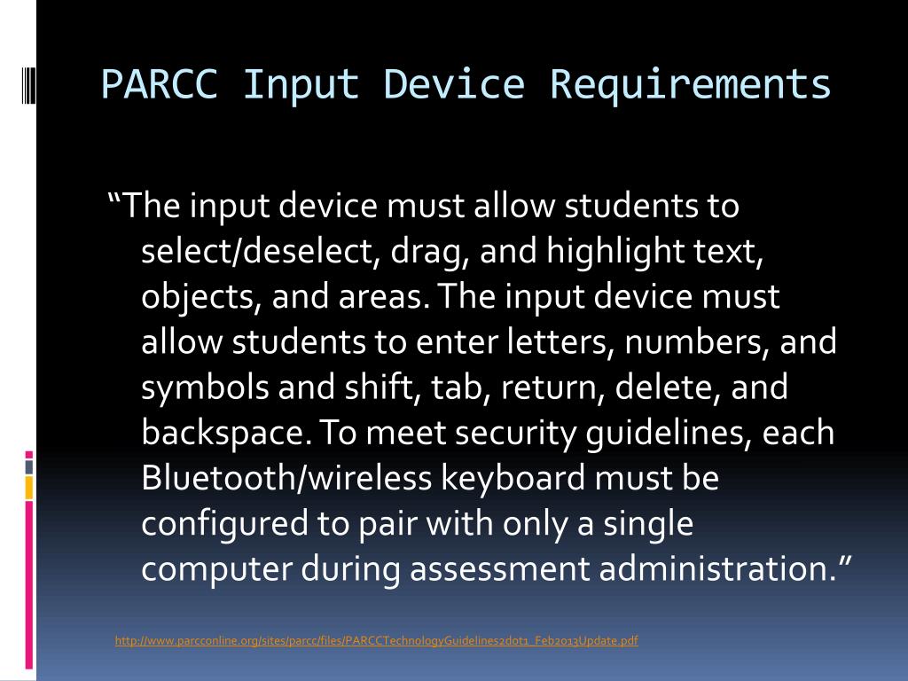 PARCC Input Device Requirements “The input device must allow students to select/deselect, drag, and highlight text, objects, and areas. The input device must allow students to enter letters, numbers, and symbols and shift, tab, return, delete, and backspace. To meet security guidelines, each Bluetooth/wireless keyboard must be configured to pair with only a single computer during assessment administration.” http://www.parcconline.org/sites/parcc/files/PARCCTechnologyGuidelines2dot1_Feb2013Update.pdf