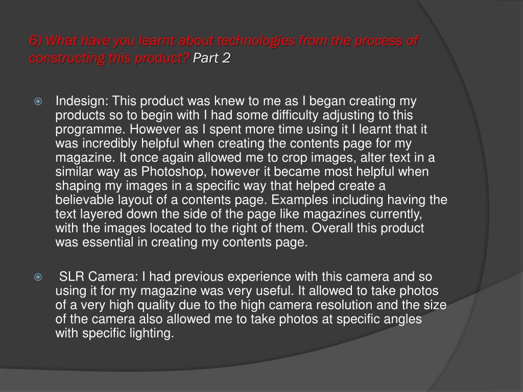 6) What have you learnt about technologies from the process of constructing this product? Part 2 • Indesign: This product was knew to me as I began creating my products so to begin with I had some difficulty adjusting to this programme. However as I spent more time using it I learnt that it was incredibly helpful when creating the contents page for my magazine. It once again allowed me to crop images, alter text in a similar way as Photoshop, however it became most helpful when shaping my images in a specific way that helped create a believable layout of a contents page. Examples including having the text layered down the side of the page like magazines currently, with the images located to the right of them. Overall this product was essential in creating my contents page. • SLR Camera: I had previous experience with this camera and so using it for my magazine was very useful. It allowed to take photos of a very high quality due to the high camera resolution and the size of the camera also allowed me to take photos at specific angles with specific lighting.