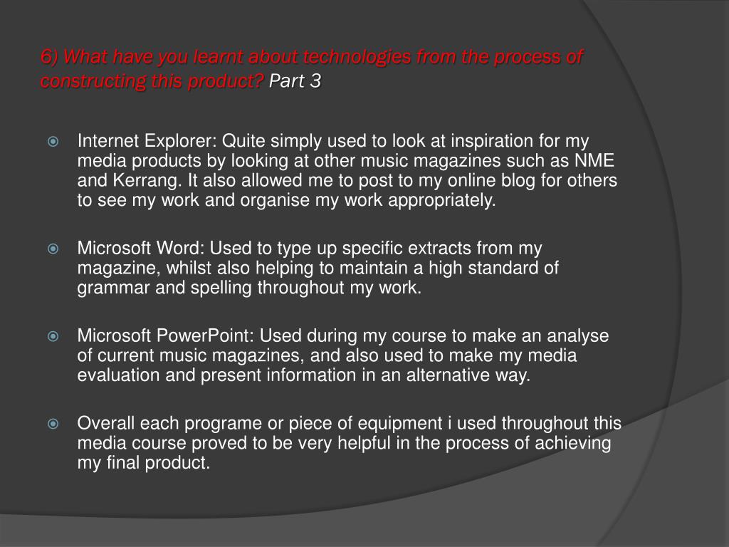6) What have you learnt about technologies from the process of constructing this product? Part 3 • Internet Explorer: Quite simply used to look at inspiration for my media products by looking at other music magazines such as NME and Kerrang. It also allowed me to post to my online blog for others to see my work and organise my work appropriately. • Microsoft Word: Used to type up specific extracts from my magazine, whilst also helping to maintain a high standard of grammar and spelling throughout my work. • Microsoft PowerPoint: Used during my course to make an analyse of current music magazines, and also used to make my media evaluation and present information in an alternative way. • Overall each programe or piece of equipment i used throughout this media course proved to be very helpful in the process of achieving my final product.