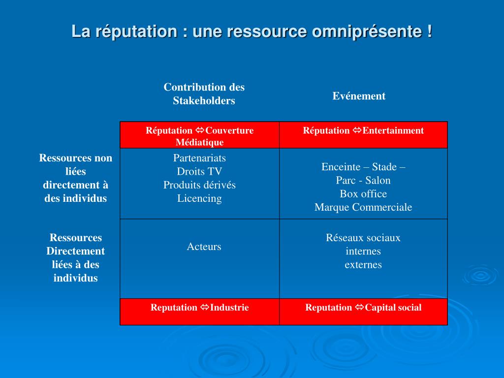 Contribution des Stakeholders Evénement Réputation Couverture Médiatique Réputation Entertainment Ressources non liées directement à des individus Partenariats Droits TV Produits dérivés Licencing Enceinte – Stade – Parc - Salon Box office Marque Commerciale Ressources Directement liées à des individus Réseaux sociaux internes externes Acteurs Reputation Industrie Reputation Capital social La réputation : une ressource omniprésente !