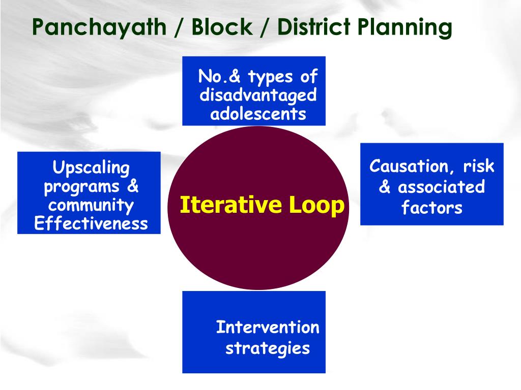 Panchayath / Block / District Planning Iterative Loop No.& types of disadvantaged adolescents Causation, risk & associated factors Upscaling programs & community Effectiveness Intervention strategies