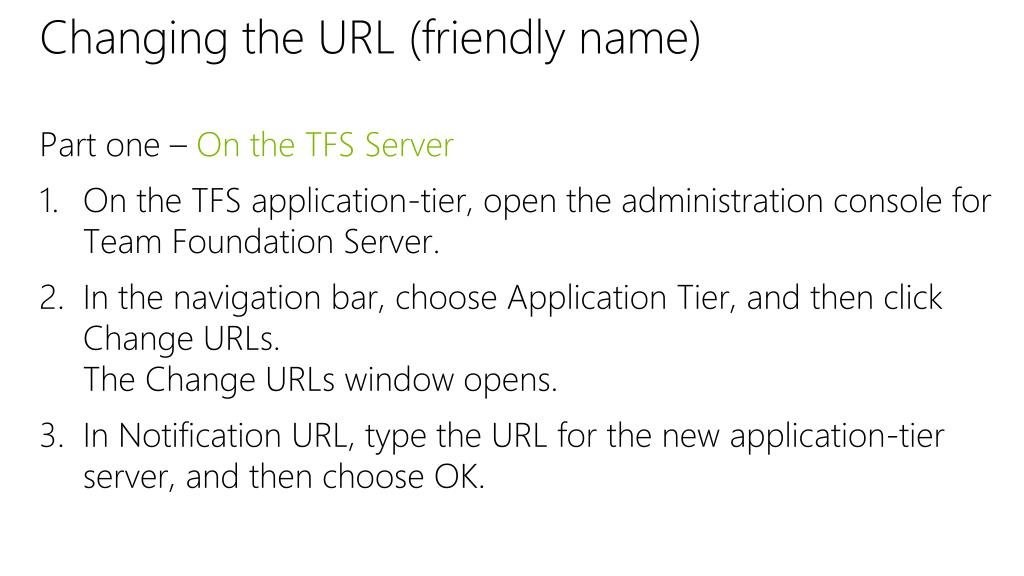 Changing the URL (friendly name) Part one – On the TFS Server • On the TFS application-tier, open the administration console for Team Foundation Server. • In the navigation bar, choose Application Tier, and then click Change URLs. The Change URLs window opens. • In Notification URL, type the URL for the new application-tier server, and then choose OK.