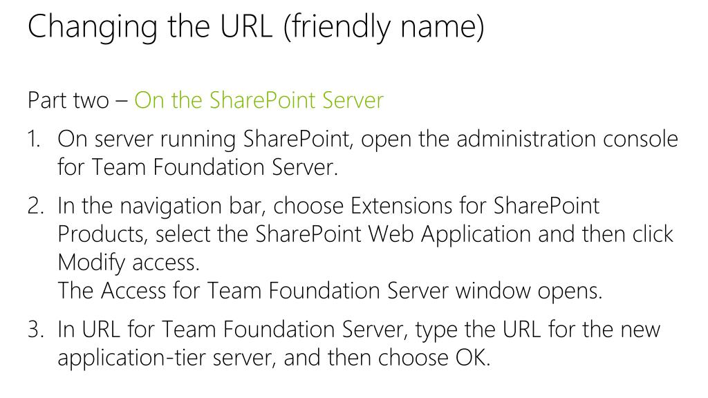Changing the URL (friendly name) Part two – On the SharePoint Server • On server running SharePoint, open the administration console for Team Foundation Server. • In the navigation bar, choose Extensions for SharePoint Products, select the SharePoint Web Application and then click Modify access.The Access for Team Foundation Server window opens. • In URL for Team Foundation Server, type the URL for the new application-tier server, and then choose OK.