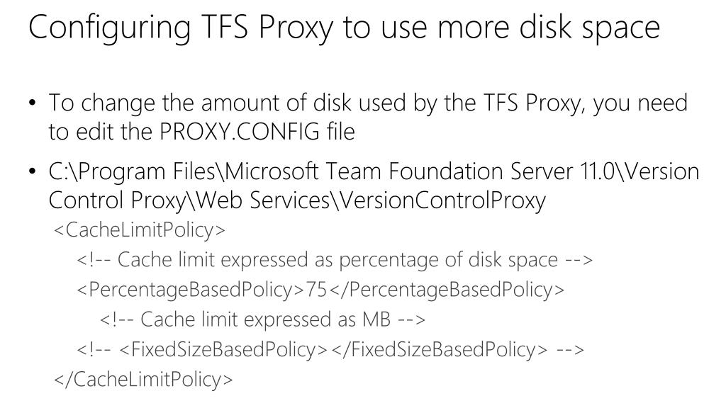 To change the amount of disk used by the TFS Proxy, you need to edit the PROXY.CONFIG file C:\Program Files\Microsoft Team Foundation Server 11.0\Version Control Proxy\Web Services\VersionControlProxy <CacheLimitPolicy> <!-- Cache limit expressed as percentage of disk space --> <PercentageBasedPolicy>75</PercentageBasedPolicy> <!-- Cache limit expressed as MB --> <!-- <FixedSizeBasedPolicy></FixedSizeBasedPolicy> --> </CacheLimitPolicy> Configuring TFS Proxy to use more disk space