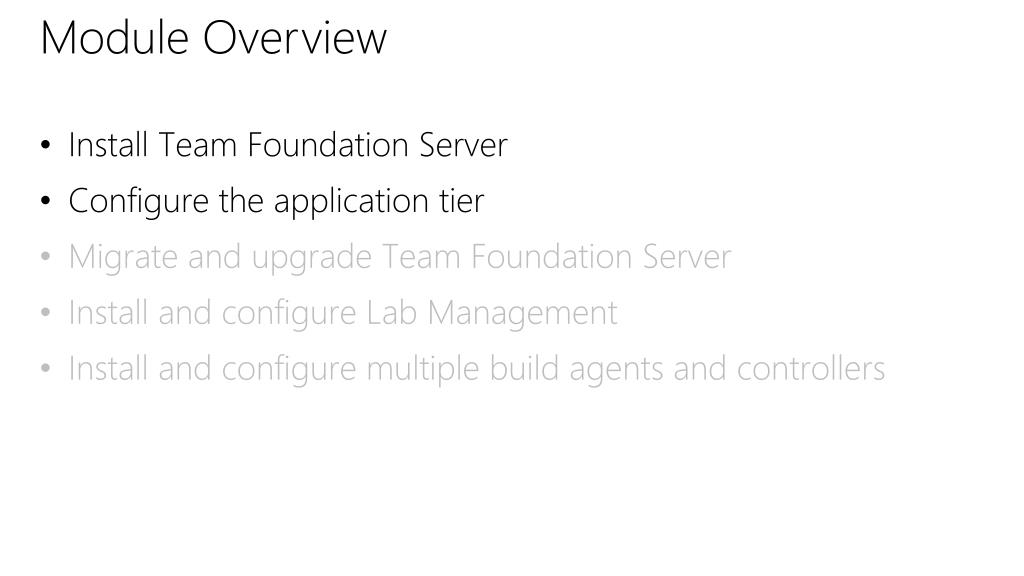 Module Overview • Install Team Foundation Server • Configure the application tier • Migrate and upgrade Team Foundation Server • Install and configure Lab Management • Install and configure multiple build agents and controllers