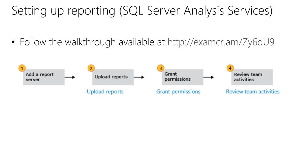 Setting up reporting (SQL Server Analysis Services) • Follow the walkthrough available at http://examcr.am/Zy6dU9