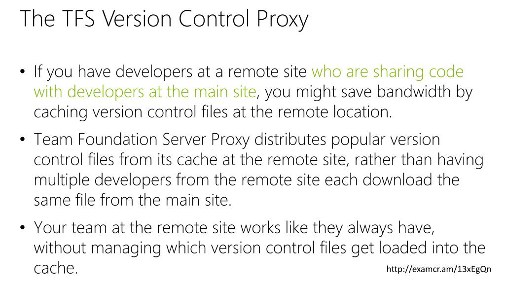 The TFS Version Control Proxy • If you have developers at a remote site who are sharing code with developers at the main site, you might save bandwidth by caching version control files at the remote location. • Team Foundation Server Proxy distributes popular version control files from its cache at the remote site, rather than having multiple developers from the remote site each download the same file from the main site. • Your team at the remote site works like they always have, without managing which version control files get loaded into the cache. http://examcr.am/13xEgQn