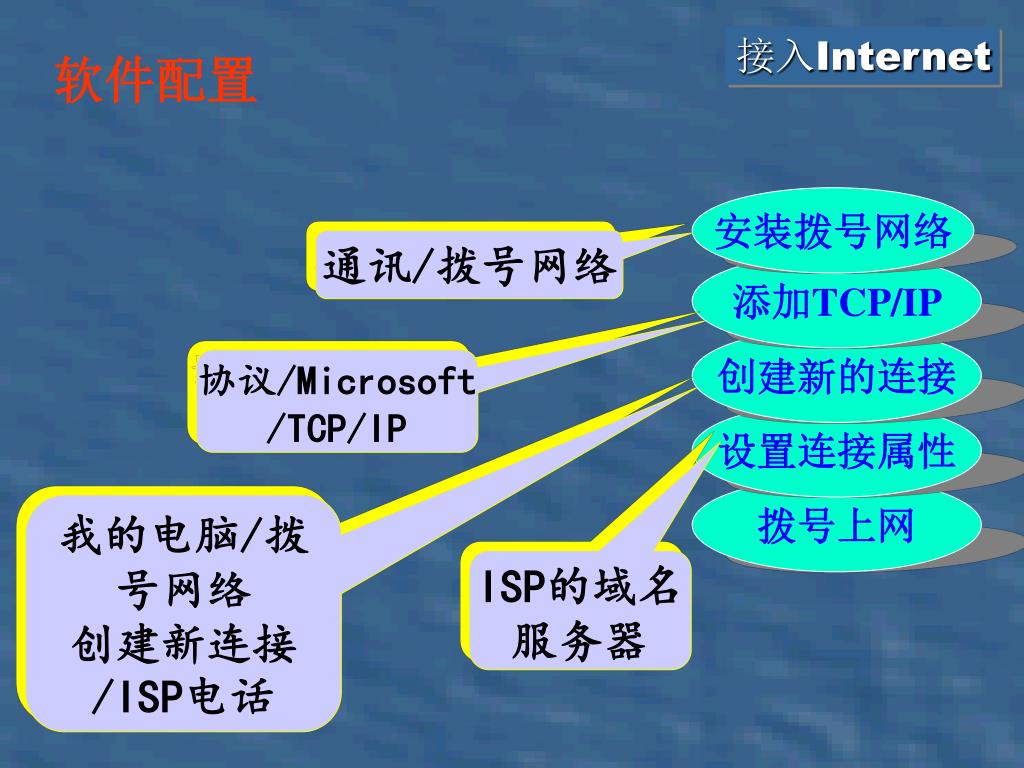 接入Internet 软件配置 安装拨号网络 通讯/拨号网络 添加TCP/IP 创建新的连接 协议/Microsoft /TCP/IP 设置连接属性 拨号上网 我的电脑/拨号网络 创建新连接/ISP电话 ISP的域名服务器