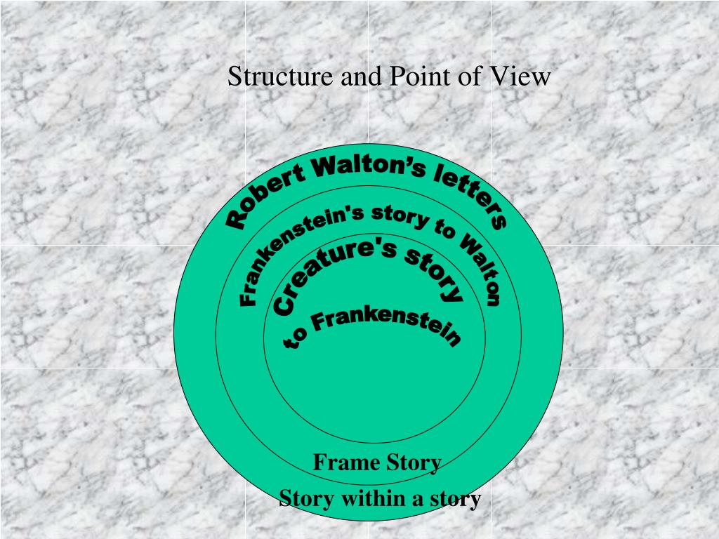 Robert Walton’s letters Frankenstein's story to Walton Creature's story to Frankenstein Structure and Point of View Frame Story Story within a story