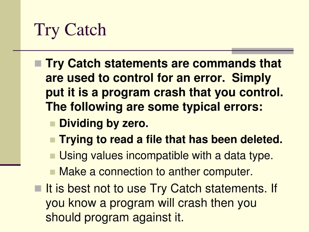 Try Catch • Try Catch statements are commands that are used to control for an error. Simply put it is a program crash that you control. The following are some typical errors: • Dividing by zero. • Trying to read a file that has been deleted. • Using values incompatible with a data type. • Make a connection to anther computer. • It is best not to use Try Catch statements. If you know a program will crash then you should program against it.