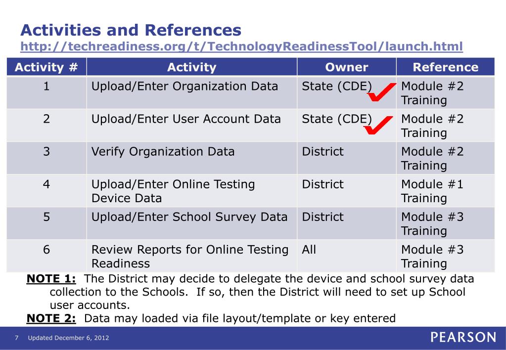 Activities and Referenceshttp://techreadiness.org/t/TechnologyReadinessTool/launch.html NOTE 1: The District may decide to delegate the device and school survey data collection to the Schools. If so, then the District will need to set up School user accounts. NOTE 2: Data may loaded via file layout/template or key entered Updated December 6, 2012