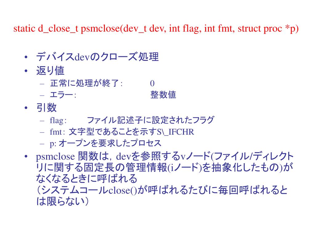 static d_close_t psmclose(dev_t dev, int flag, int fmt, struct proc *p) • デバイスdevのクローズ処理 • 返り値 • 正常に処理が終了: 0 • エラー: 整数値 • 引数 • flag: ファイル記述子に設定されたフラグ • fmt: 文字型であることを示すS\_IFCHR • p: オープンを要求したプロセス • psmclose 関数は,devを参照するvノード(ファイル/ディレクトリに関する固定長の管理情報(iノード)を抽象化したもの)がなくなるときに呼ばれる(システムコールclose()が呼ばれるたびに毎回呼ばれるとは限らない)