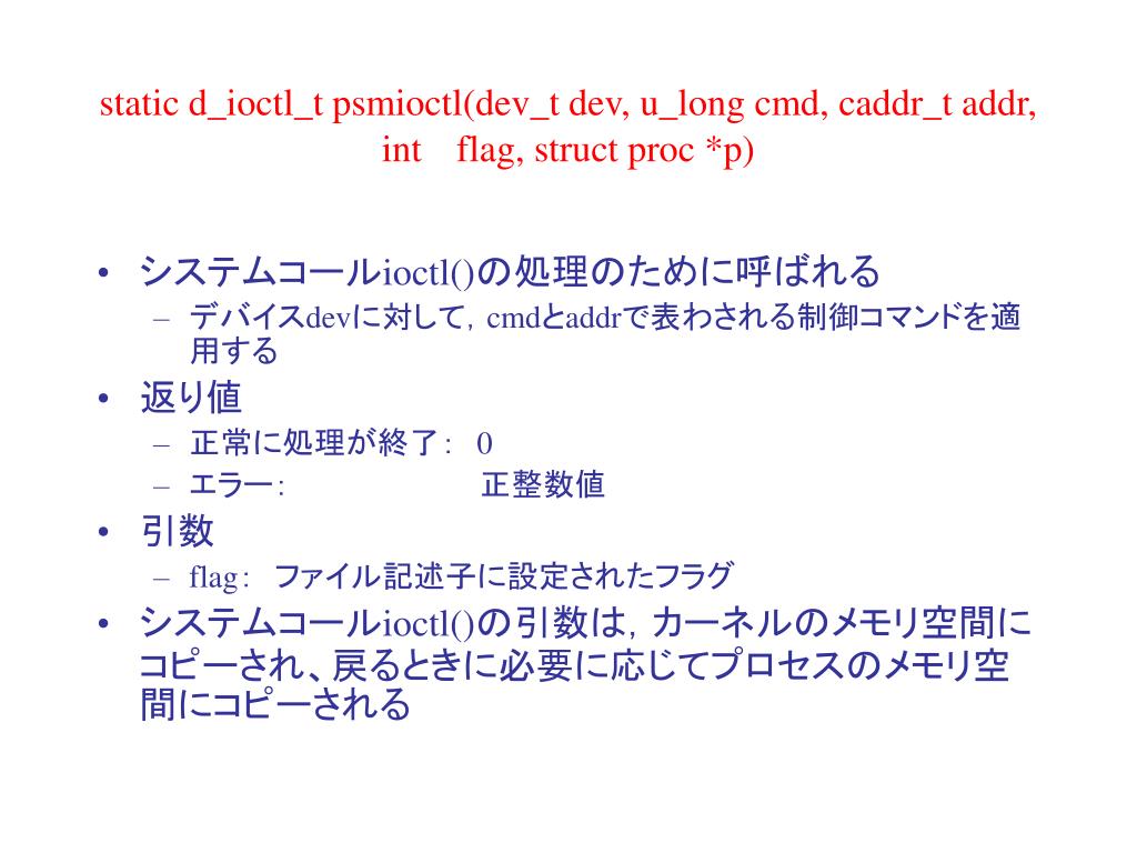 static d_ioctl_t psmioctl(dev_t dev, u_long cmd, caddr_t addr, int flag, struct proc *p) • システムコールioctl()の処理のために呼ばれる • デバイスdevに対して,cmdとaddrで表わされる制御コマンドを適用する • 返り値 • 正常に処理が終了: 0 • エラー: 正整数値 • 引数 • flag: ファイル記述子に設定されたフラグ • システムコールioctl()の引数は,カーネルのメモリ空間にコピーされ、戻るときに必要に応じてプロセスのメモリ空間にコピーされる