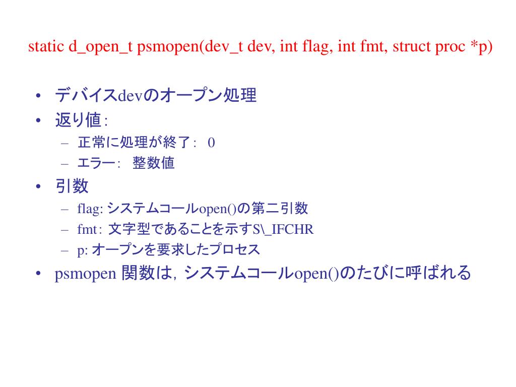static d_open_t psmopen(dev_t dev, int flag, int fmt, struct proc *p) • デバイスdevのオープン処理 • 返り値: • 正常に処理が終了: 0 • エラー: 整数値 • 引数 • flag: システムコールopen()の第二引数 • fmt: 文字型であることを示すS\_IFCHR • p: オープンを要求したプロセス • psmopen 関数は,システムコールopen()のたびに呼ばれる