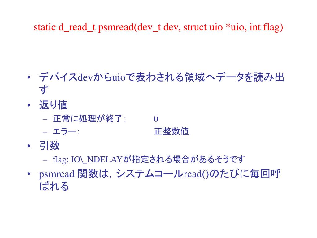 static d_read_t psmread(dev_t dev, struct uio *uio, int flag) • デバイスdevからuioで表わされる領域へデータを読み出す • 返り値 • 正常に処理が終了: 0 • エラー: 正整数値 • 引数 • flag: IO\_NDELAYが指定される場合があるそうです • psmread 関数は,システムコールread()のたびに毎回呼ばれる