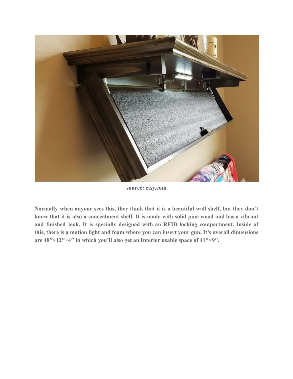 source: etsy.com Normally when anyone sees this, they think that it is a beautiful wall shelf, but they don’t know that it is also a concealment shelf. It is made with solid pine wood and has a vibrant and finished look. It is specially designed with an RFID locking compartment. Inside of this, there is a motion light and foam where you can insert your gun. It’s overall dimensions are 48″×12″×4″ in which you’ll also get an Interior usable space of 41″×9″.