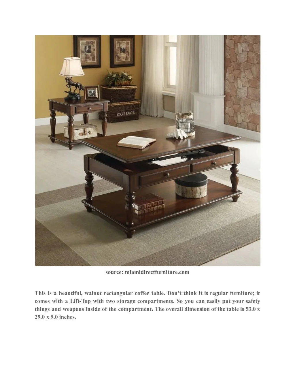 source: miamidirectfurniture.com This is a beautiful, walnut rectangular coffee table. Don’t think it is regular furniture; it comes with a Lift-Top with two storage compartments. So you can easily put your safety things and weapons inside of the compartment. The overall dimension of the table is 53.0 x 29.0 x 9.0 inches.