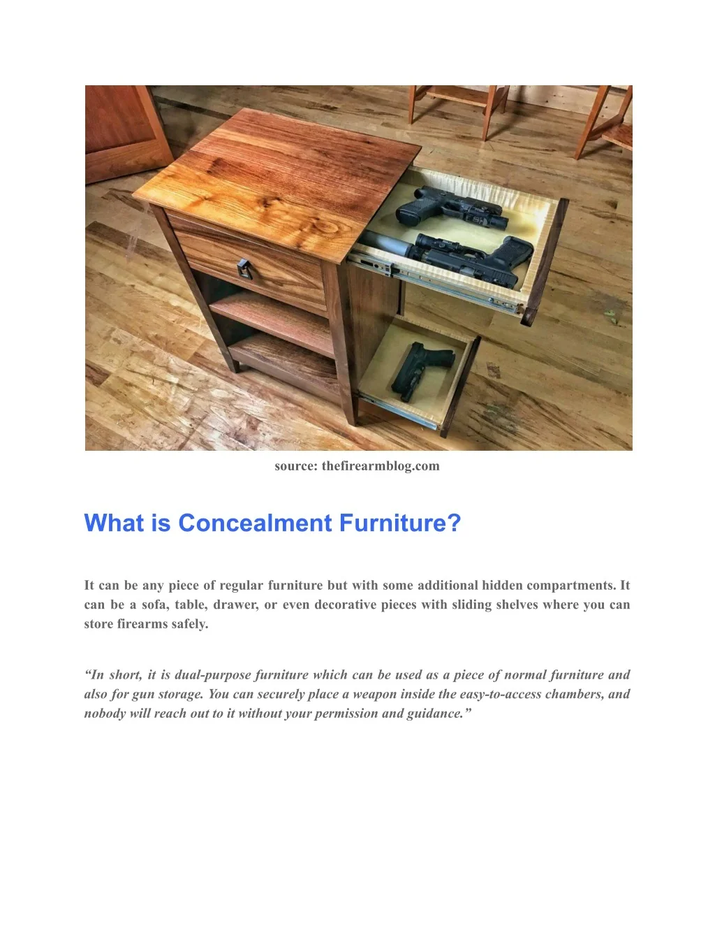 source: thefirearmblog.com What is Concealment Furniture? It can be any piece of regular furniture but with some additional hidden compartments. It can be a sofa, table, drawer, or even decorative pieces with sliding shelves where you can store firearms safely. “In short, it is dual-purpose furniture which can be used as a piece of normal furniture and also for gun storage. You can securely place a weapon inside the easy-to-access chambers, and nobody will reach out to it without your permission and guidance.”