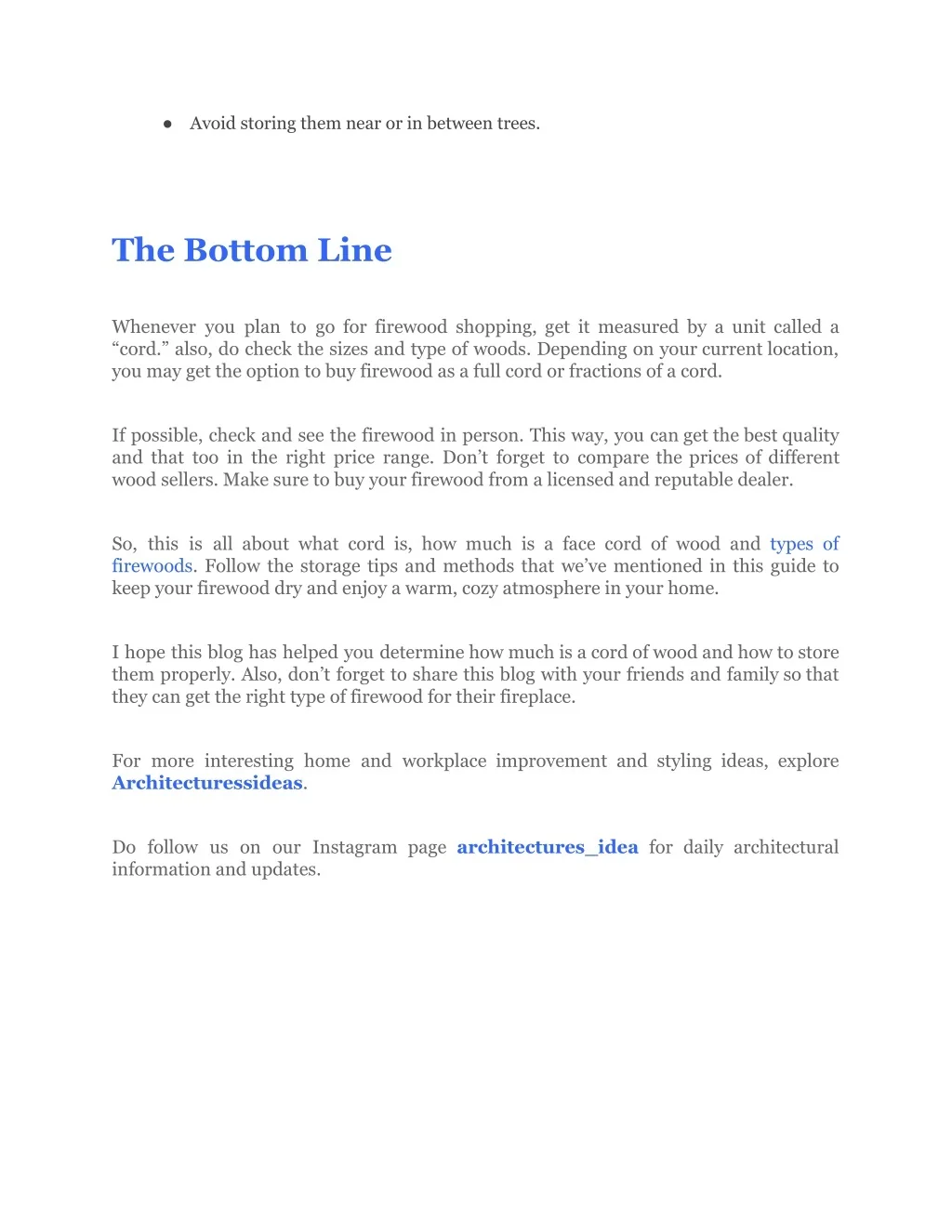 Avoid storing them near or in between trees. ● The Bottom Line Whenever you plan to go for firewood shopping, get it measured by a unit called a “cord.” also, do check the sizes and type of woods. Depending on your current location, you may get the option to buy firewood as a full cord or fractions of a cord. If possible, check and see the firewood in person. This way, you can get the best quality and that too in the right price range. Don’t forget to compare the prices of different wood sellers. Make sure to buy your firewood from a licensed and reputable dealer. So, this is all about what cord is, how much is a face cord of wood and types of firewoods. Follow the storage tips and methods that we’ve mentioned in this guide to keep your firewood dry and enjoy a warm, cozy atmosphere in your home. I hope this blog has helped you determine how much is a cord of wood and how to store them properly. Also, don’t forget to share this blog with your friends and family so that they can get the right type of firewood for their fireplace. For more interesting home and workplace improvement and styling ideas, explore Architecturessideas. Do follow us on our Instagram page architectures_idea for daily architectural information and updates.
