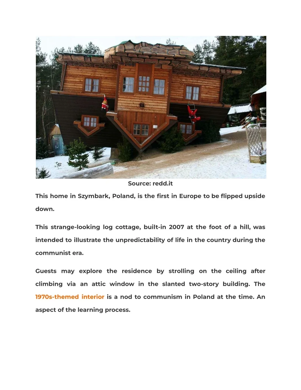 Source: redd.it This home in Szymbark, Poland, is the first in Europe to be flipped upside down. This strange-looking log cottage, built-in 2007 at the foot of a hill, was intended to illustrate the unpredictability of life in the country during the communist era. Guests may explore the residence by strolling on the ceiling after climbing via an attic window in the slanted two-story building. The 1970s-themed interior is a nod to communism in Poland at the time. An aspect of the learning process.