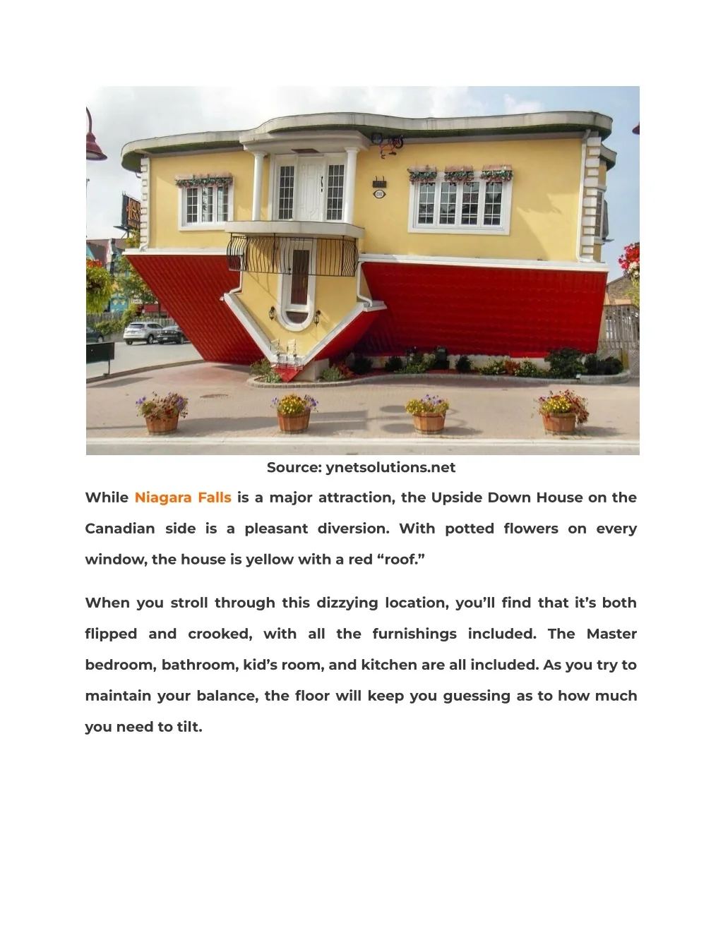 Source: ynetsolutions.net While Niagara Falls is a major attraction, the Upside Down House on the Canadian side is a pleasant diversion. With potted flowers on every window, the house is yellow with a red “roof.” When you stroll through this dizzying location, you’ll find that it’s both flipped and crooked, with all the furnishings included. The Master bedroom, bathroom, kid’s room, and kitchen are all included. As you try to maintain your balance, the floor will keep you guessing as to how much you need to tilt.
