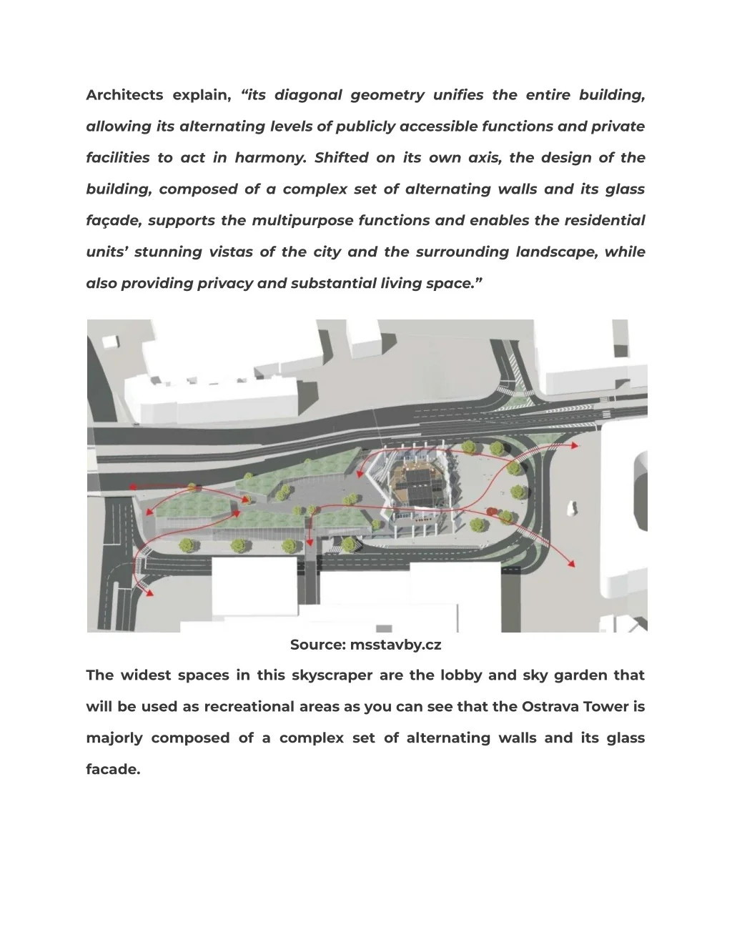 Architects explain, “its diagonal geometry unifies the entire building, allowing its alternating levels of publicly accessible functions and private facilities to act in harmony. Shifted on its own axis, the design of the building, composed of a complex set of alternating walls and its glass façade, supports the multipurpose functions and enables the residential units’ stunning vistas of the city and the surrounding landscape, while also providing privacy and substantial living space.” Source: msstavby.cz The widest spaces in this skyscraper are the lobby and sky garden that will be used as recreational areas as you can see that the Ostrava Tower is majorly composed of a complex set of alternating walls and its glass facade.