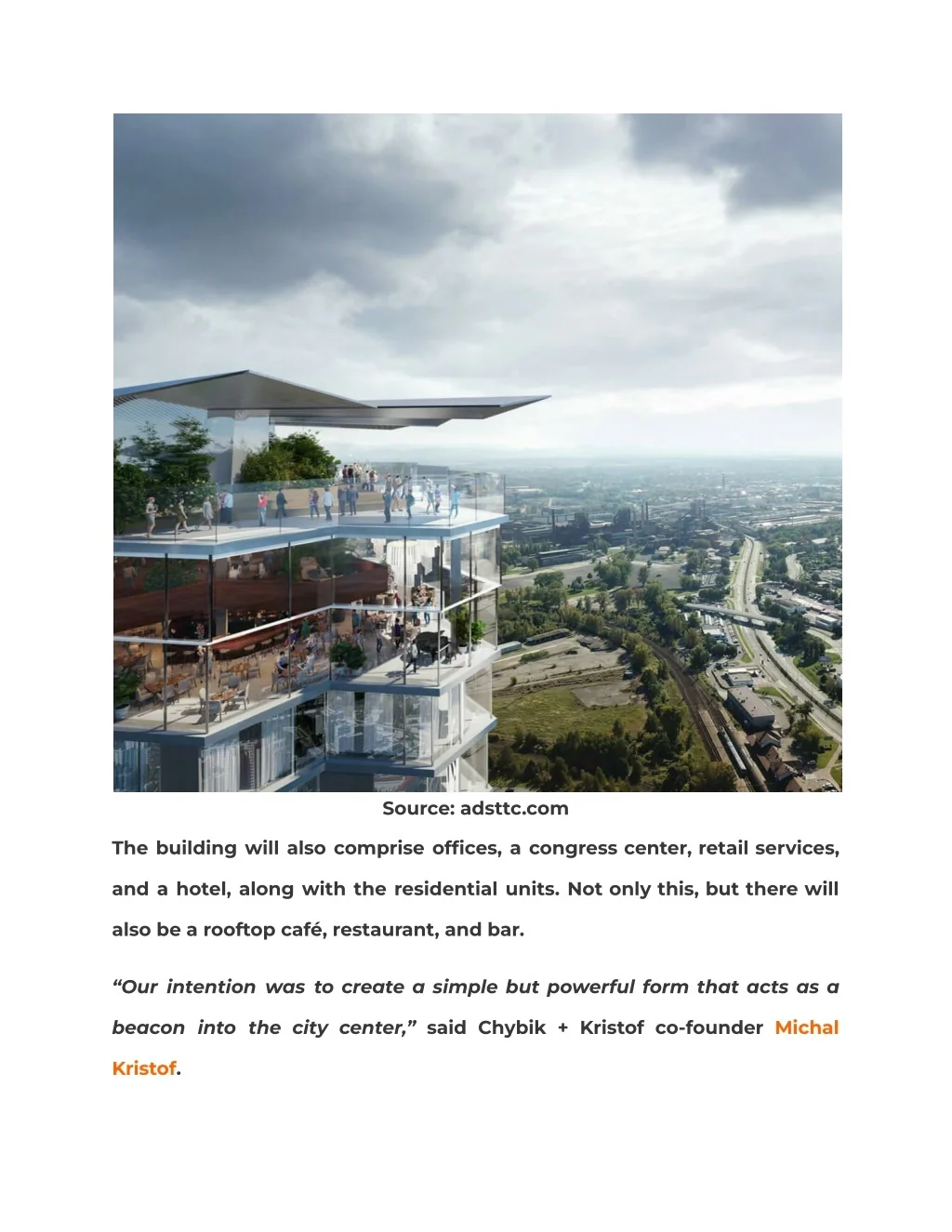 Source: adsttc.com The building will also comprise offices, a congress center, retail services, and a hotel, along with the residential units. Not only this, but there will also be a rooftop café, restaurant, and bar. “Our intention was to create a simple but powerful form that acts as a beacon into the city center,” said Chybik + Kristof co-founder Michal Kristof.
