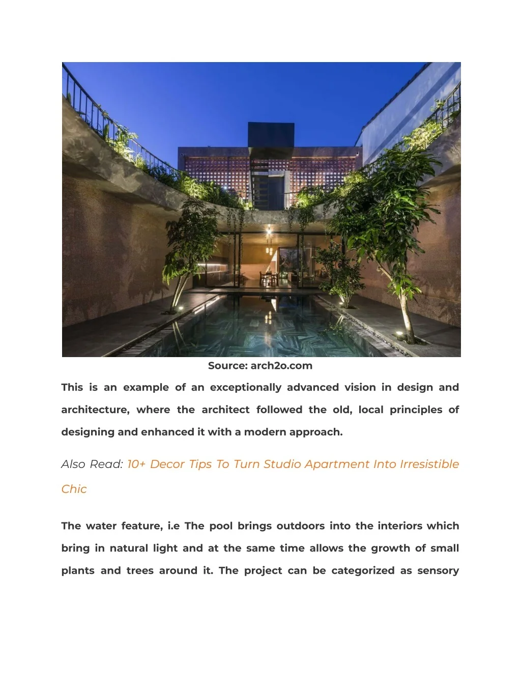Source: arch2o.com This is an example of an exceptionally advanced vision in design and architecture, where the architect followed the old, local principles of designing and enhanced it with a modern approach. Also Read: 10+ Decor Tips To Turn Studio Apartment Into Irresistible Chic The water feature, i.e The pool brings outdoors into the interiors which bring in natural light and at the same time allows the growth of small plants and trees around it. The project can be categorized as sensory