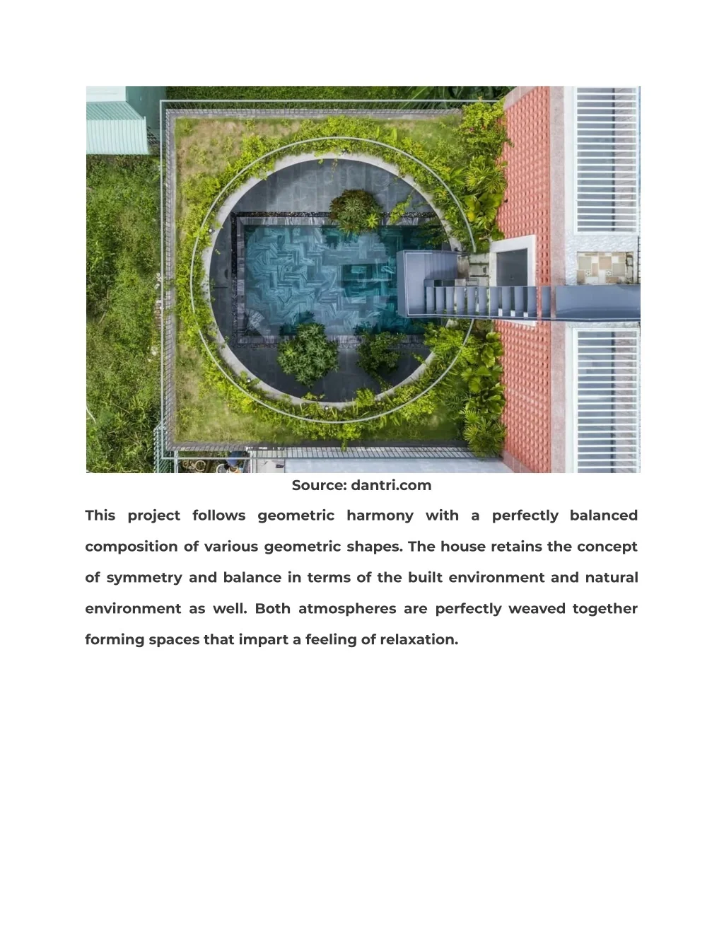 Source: dantri.com This project follows geometric harmony with a perfectly balanced composition of various geometric shapes. The house retains the concept of symmetry and balance in terms of the built environment and natural environment as well. Both atmospheres are perfectly weaved together forming spaces that impart a feeling of relaxation.