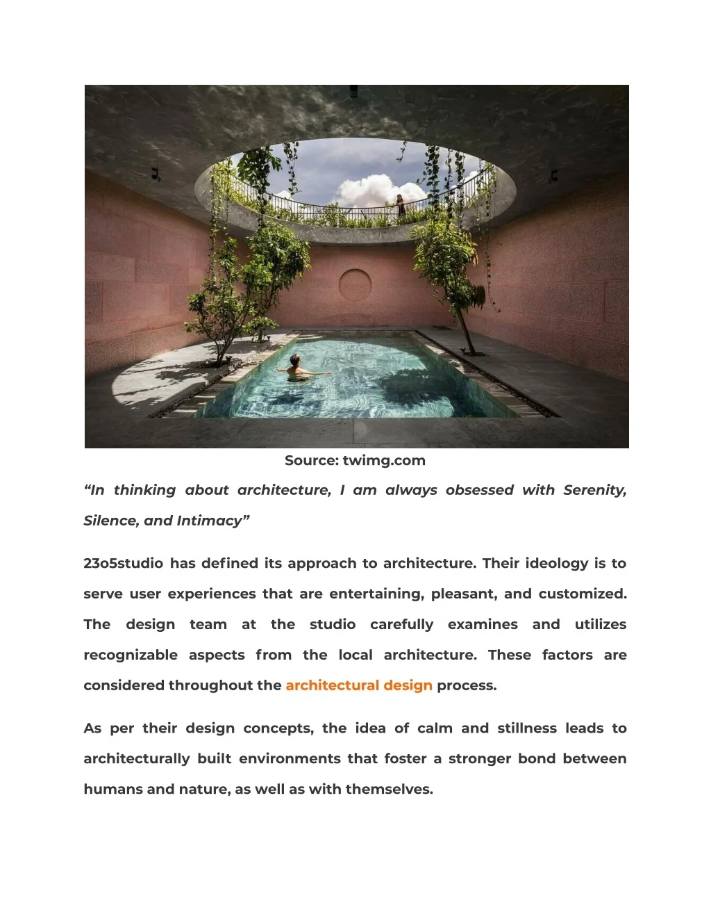 Source: twimg.com “In thinking about architecture, I am always obsessed with Serenity, Silence, and Intimacy” 23o5studio has defined its approach to architecture. Their ideology is to serve user experiences that are entertaining, pleasant, and customized. The design team at the studio carefully examines and utilizes recognizable aspects from the local architecture. These factors are considered throughout the architectural design process. As per their design concepts, the idea of calm and stillness leads to architecturally built environments that foster a stronger bond between humans and nature, as well as with themselves.