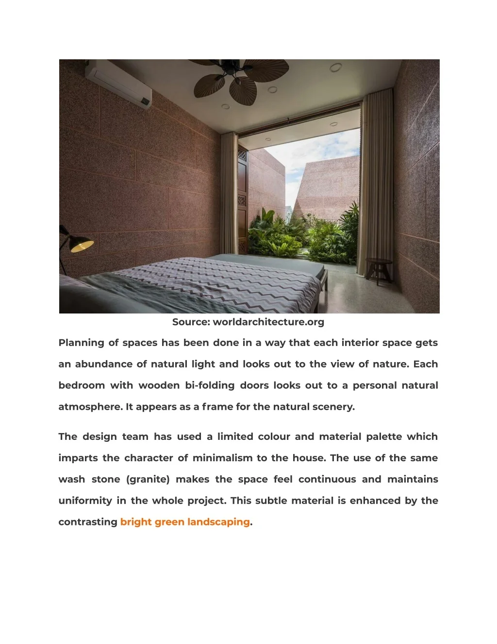 Source: worldarchitecture.org Planning of spaces has been done in a way that each interior space gets an abundance of natural light and looks out to the view of nature. Each bedroom with wooden bi-folding doors looks out to a personal natural atmosphere. It appears as a frame for the natural scenery. The design team has used a limited colour and material palette which imparts the character of minimalism to the house. The use of the same wash stone (granite) makes the space feel continuous and maintains uniformity in the whole project. This subtle material is enhanced by the contrasting bright green landscaping.