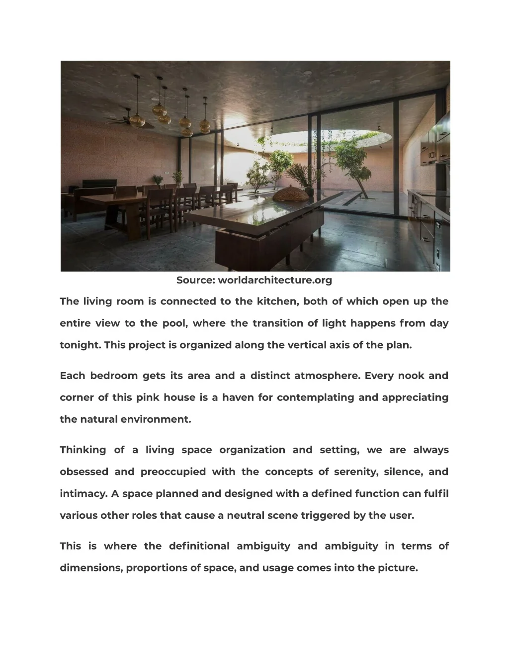 Source: worldarchitecture.org The living room is connected to the kitchen, both of which open up the entire view to the pool, where the transition of light happens from day tonight. This project is organized along the vertical axis of the plan. Each bedroom gets its area and a distinct atmosphere. Every nook and corner of this pink house is a haven for contemplating and appreciating the natural environment. Thinking of a living space organization and setting, we are always obsessed and preoccupied with the concepts of serenity, silence, and intimacy. A space planned and designed with a defined function can fulfil various other roles that cause a neutral scene triggered by the user. This is where the definitional ambiguity and ambiguity in terms of dimensions, proportions of space, and usage comes into the picture.