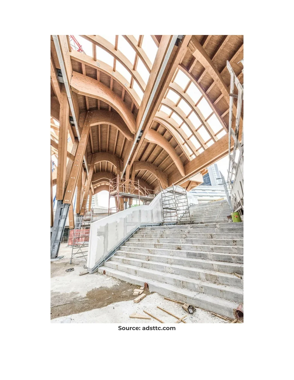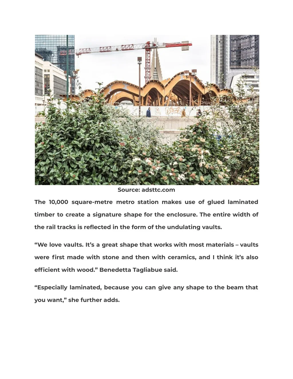 Source: adsttc.com The 10,000 square-metre metro station makes use of glued laminated timber to create a signature shape for the enclosure. The entire width of the rail tracks is reflected in the form of the undulating vaults. “We love vaults. It’s a great shape that works with most materials – vaults were first made with stone and then with ceramics, and I think it’s also efficient with wood.” Benedetta Tagliabue said. “Especially laminated, because you can give any shape to the beam that you want,” she further adds.