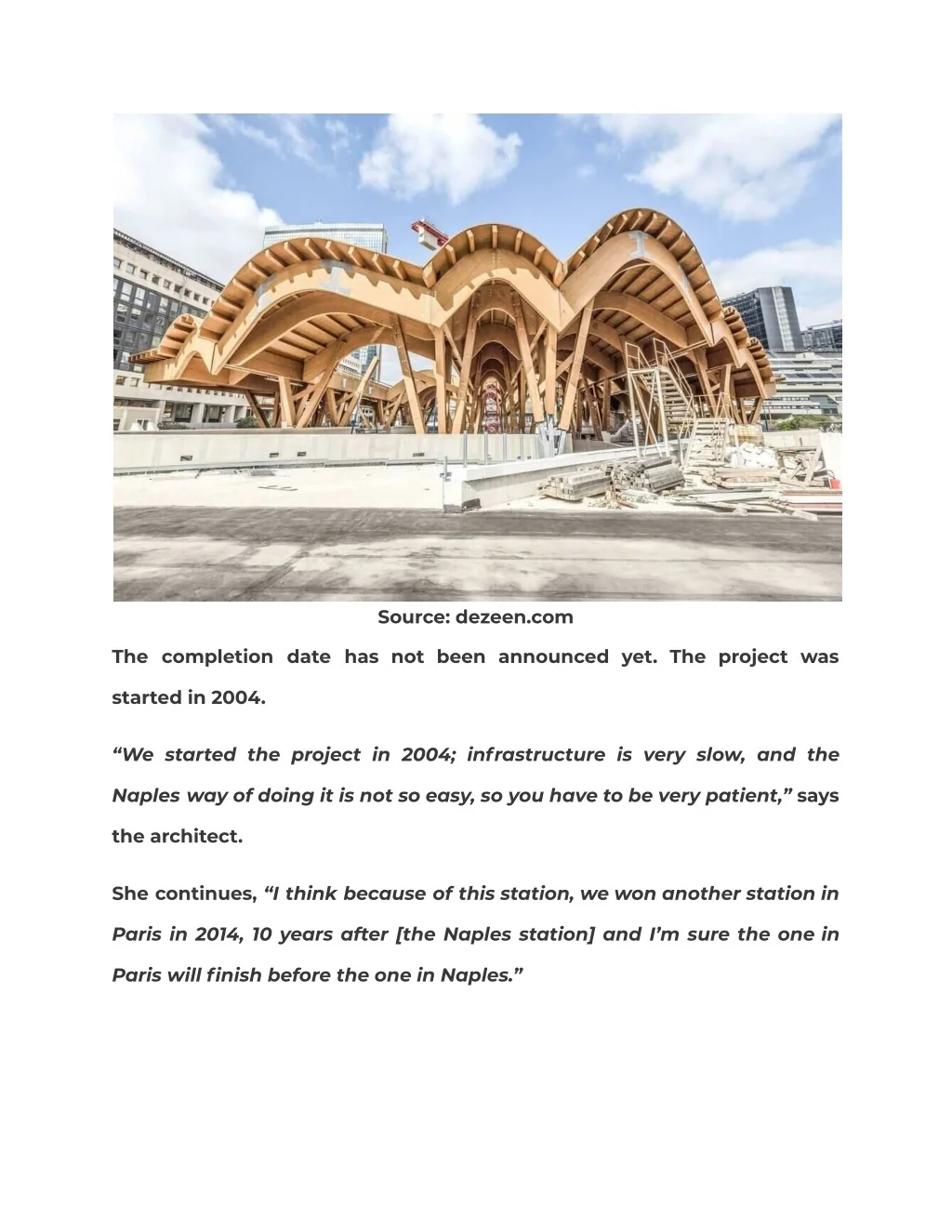 very clean,” says Benedetta Tagliabue. “It didn’t work because it’s so different from the rest of Naples.” Source: adsttc.com The station is constructed from mass timber taking cues from older parts of Naples. “It’s a place where there are a lot of offices and a lot of business space but at five o’clock at night, it’s deserted and very dangerous,” she said. “So the idea of making a new station there and connecting with the new subway line was also to try to introduce a piece of nature and a piece of the original part of Naples into this artificial piece of the city.”