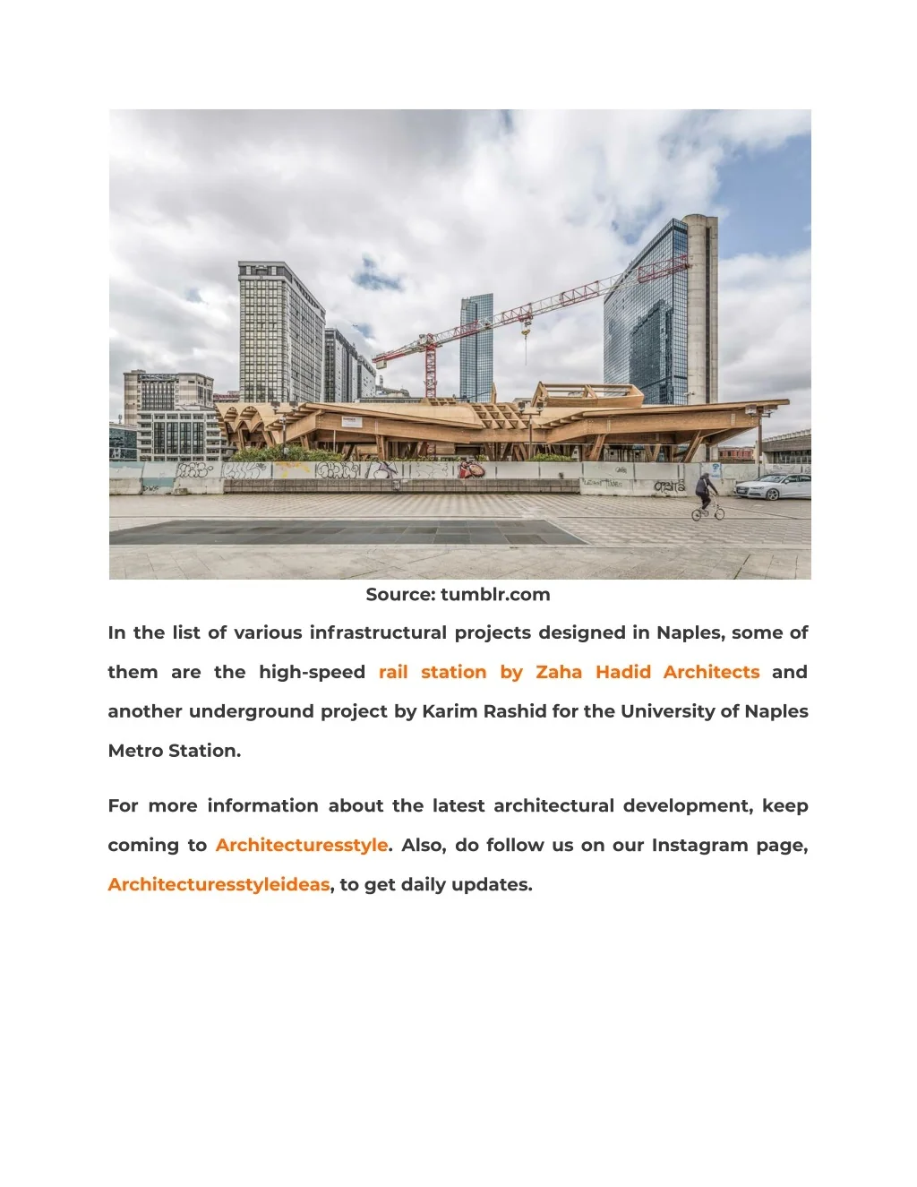 Source: tumblr.com In the list of various infrastructural projects designed in Naples, some of them are the high-speed rail station by Zaha Hadid Architects and another underground project by Karim Rashid for the University of Naples Metro Station. For more information about the latest architectural development, keep coming to Architecturesstyle. Also, do follow us on our Instagram page, Architecturesstyleideas, to get daily updates.