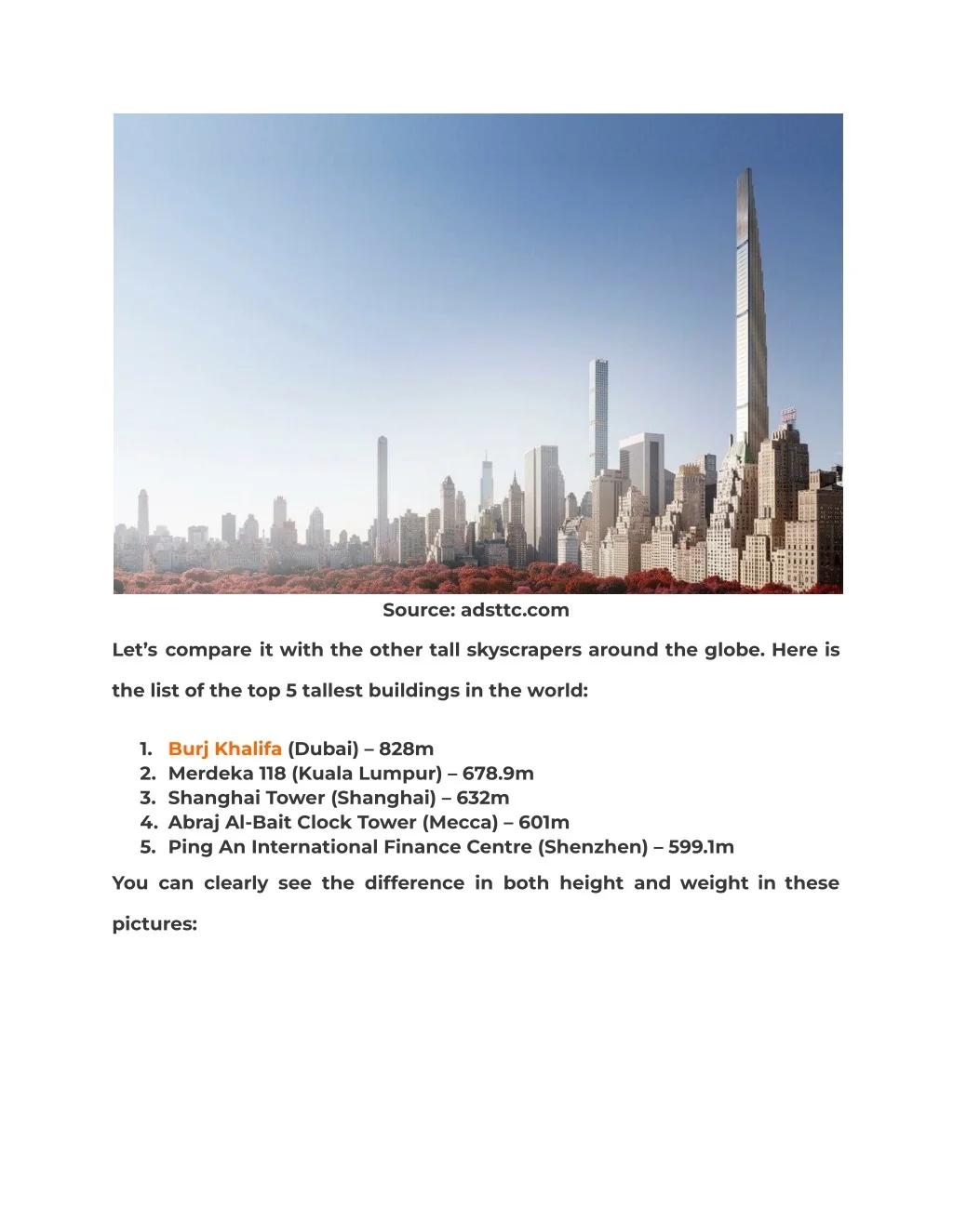 Source: adsttc.com Let’s compare it with the other tall skyscrapers around the globe. Here is the list of the top 5 tallest buildings in the world: 1. Burj Khalifa (Dubai) – 828m 2. Merdeka 118 (Kuala Lumpur) – 678.9m 3. Shanghai Tower (Shanghai) – 632m 4. Abraj Al-Bait Clock Tower (Mecca) – 601m 5. Ping An International Finance Centre (Shenzhen) – 599.1m You can clearly see the difference in both height and weight in these pictures: